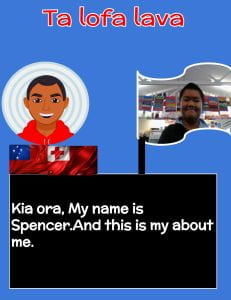 Talofa lava, My name is Spencer and.Today I am going to share with you what I have been learning about in Google drawing.Today I have been learning about.How to make our own avatar and how to take an photo of our selfs.I really enjoyed the lesson today.As you can see in my picture, I have been learning about inserting pictures and my 2 cultrues(Samoa and Tonga).The challenging part of making this was.Making my own avatar it was a little bit hard but I successfuly finished it.The about me poster was really fun and challenging at the same time.I love my poster and I am so greatful. Making the poster.Thanks Miss Toland for helping us make this about me poster. Thanks for reading my About me poster. Manuia le aso.